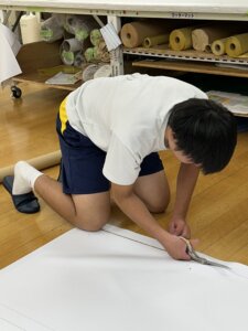 床の上で膝をつきながらのハサミでの裁断は、思った以上に苦戦している様子。ある生徒さんに感想を聞いてみると、「ただ切るだけと思っていたけど、想像以上に大変でヤバイ」と話してくれました。