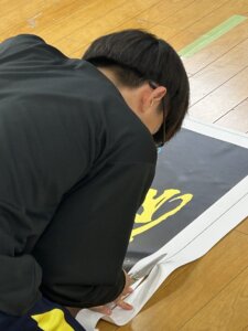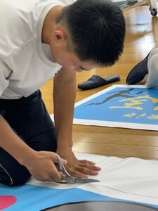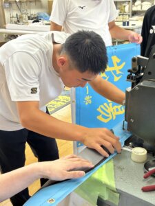 午後は印刷したバナーの加工作業。前日の練習の成果を発揮する時です。