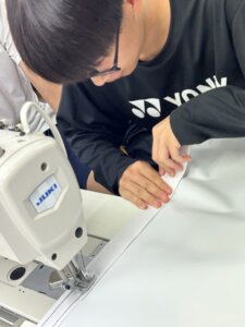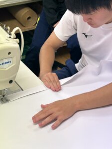 ハサミでの裁断、ミシンでの縫製。前日に「想像以上に大変でヤバイ」と話していた作業ですが、2日目は少し慣れた様子で取り組んでいました。それでも、真っ直ぐに切ること、きれいに縫うことは簡単ではありません。